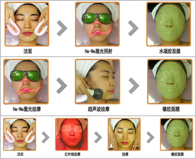 洁面(清理皮肤) > He-Ne激光照射(促进皮肤再生) > 水凝胶面膜(补充水分)
