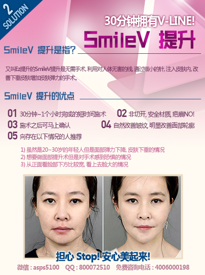 也称作EZ提升的smile V lifting是无需手术,只利用对人体无害的特殊线去除皱纹、提升下垂的肌肤、恢复弹力的肌肤和提升V型脸的手术。这种手术于2005年2月由美国的整形外科学会开发。此后, 首尔整形医院为了提高安全性与顾客满意度,一直进行着临床研究。因为这种线在心脏手术中要使用,所以对人体无害,利用无害的特殊材质的线,不剖开皮肤表面,通过细小的针注入皮肤,这种手术可称作是给与肌肤弹力与提升效果的手术。可在短时间内通过手术期待快捷、安全和半永久性的效果。