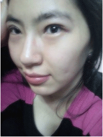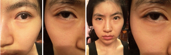 从照片可以看出,有眼有多重双眼皮,非常难看!加上经过多次的修复手术,伤到了睁眼的肌肉,产生了眼睑下垂。。睁眼的力量减少了,要用额头和眉毛的肌肉来睁眼,结果产生了皱纹并且头总是很疼。就像个怪兽的眼睛一样,我拍照的时候摆出了自然的表情,竟然出现这样的表情。。