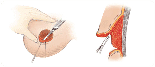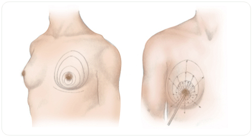 • 如果女性型乳房的主要原因是过度发达的乳腺组织的话,得去除该组织。小的乳腺组织使用脂肪吸引器可以跟脂肪组织同时去除。 但是乳腺组织过度发达的话,得做切开乳头乳晕周围去除皮肤内部的乳腺组织的皮下乳房切开术。