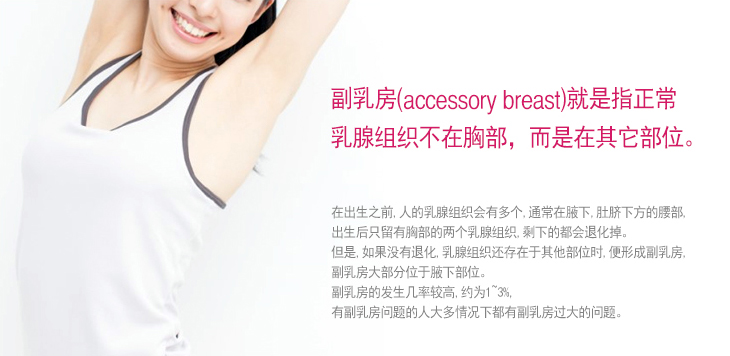 当腋下部位出现隆起症状时,要到当地医院接受检查。 副乳房会和胸部的乳腺组织一同产生变化,也会出现月经周期性的疼痛。怀孕、分娩后副乳房也会变大。 副乳房的情形多样,有的仅仅是像赘疣一样的乳突痕迹,也有脂肪、乳腺组织大量存在的情形。 副乳房问题可以不进行特殊治疗,主要是出于美容的目的才对副乳房进行治疗。