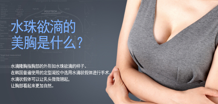 乳房手术最重要的分之一就是乳房下线之间的距,即使是胸部小的女史也有乳房下线,如果从下线到乳头的距离非常短的话,那么手术就会变得不自然。这种情况下,适合使用水滴假体