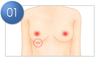 在乳房和上腹部之间的皱纹处切开3~4cm.