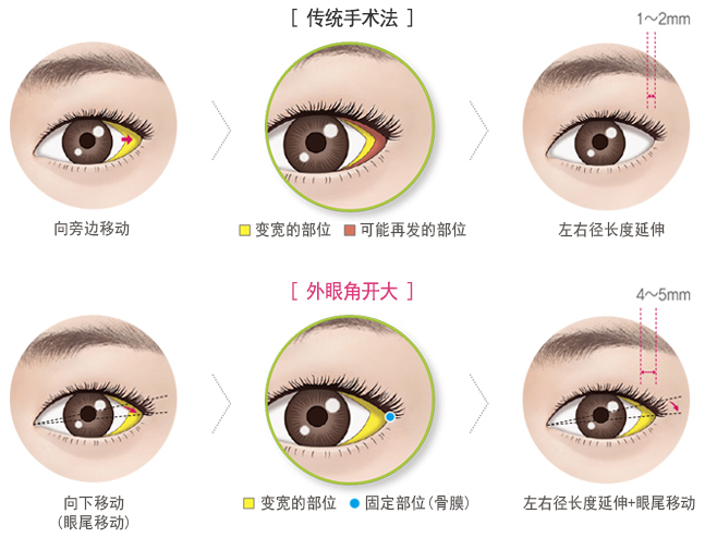 魔力外眦手术首先切开外眦,使皮肤与结膜分离,调整位置后,使它们不再粘在一起,这种手术不会产生大的伤疤,同时还能略微拉长眼睛,使眼睛看起来更立体。 手术后实际会变大4~5mm,与传统的手术方法相比,效果更加明显,复发率低。该手术的优点就是可以让上扬的眼尾看起来略微下降,手术后基本看不到伤疤。