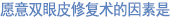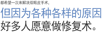 实际上修复术的手术法按每个情况都不同,所以诊断是关键。 知道具体原因才可以把握准确的手术法 每个症状的修复术手术法都不同。愿意做修复术的原因和各人的要求不同,而且按照之前的手术种类修复的手术法也不同。 所以通过准确的诊断才能决定治疗远侧。 要做手术的所有的人都愿意一模一样的两边眼睛大小,但因为本身眼睛大小是不对称的,很难达到这程度。 所以修复术得以自然为目的才对。 患者都只看自己的眼睛,会觉得差异大,其实其他人眼里没有什么差异。 一般愿意修复术的情况是 :