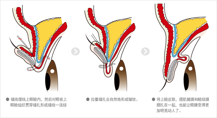 用线将帮助睁开眼睛的肌肉绑紧而缩短肌肉的长度,因此不用特意做双眼皮手术,也能让眼睛变得更加明亮动人。