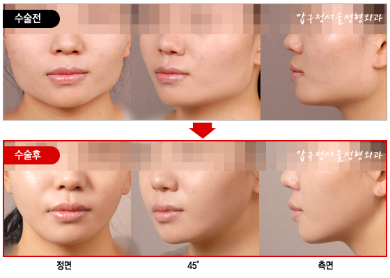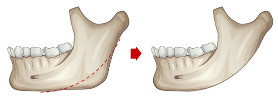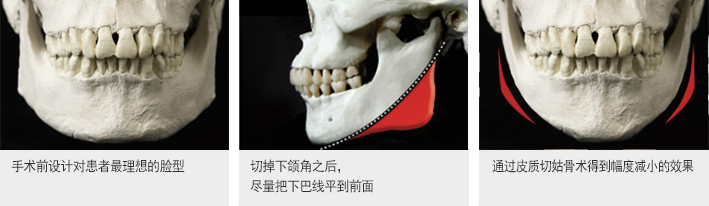 从侧面说明,从下颚耳底部分有棱角的下颚角处向下巴尖方向一次性切除骨头,让线条柔和。 一直延伸到前面的切除得细长柔和的曲线不仅可以打造自然的下颚侧面, 从正面看起来四方得脸型也会得到缓解,同时实现柔和女性化的脸型。 尤其,对相当于下颚两侧部位的耳底部位的下颚角张开过大发挥最大效果,从侧面和正面均可获得良好的结果。 但是,虽然下颚看似有棱角,但下颚张开角度小且耳底部位不张开, 反而向内卷起时,即使可以消除四方的下颚角,但缩小脸的效果可能稍微欠佳。