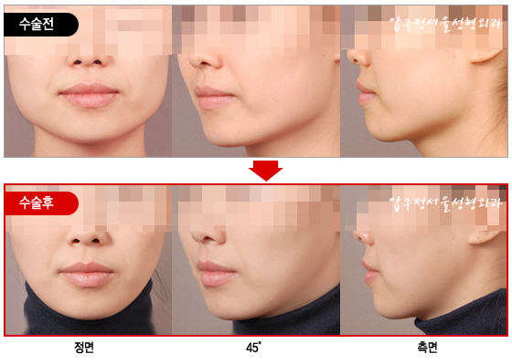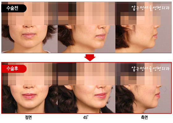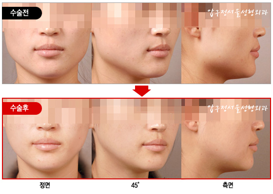 这尤其是从正面看时看出方下巴的情况。 仅是下颌角骨,贴在下颌角骨侧面的咬肌厚的情况也使下巴显得方形。有的人只发达了肌肉,但实际上大多数人的肌肉和下颌角骨一同发达。在这样的情况下,可以使用减小肌肉的体积的方法,最近最普遍用的方法是肉毒素注射和中频咬肌缩小术。除了这些,做皮质切骨术的话,下颌角的侧面厚度变小,咬肌随之变小,也可以得到下颌角缩小效果。