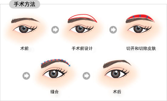 在眉毛上缘切开一个小切口,切除后向上提拉皮肤,在骨膜上固定牢固,以防止再次下垂。