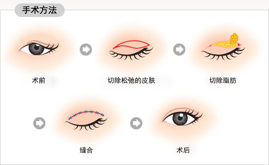 在上眼睑设计切口,切除松弛的皮肤和多余的脂肪,调整睁眼肌肉的力度,使患者可以自然地睁眼。