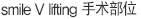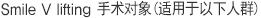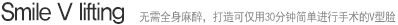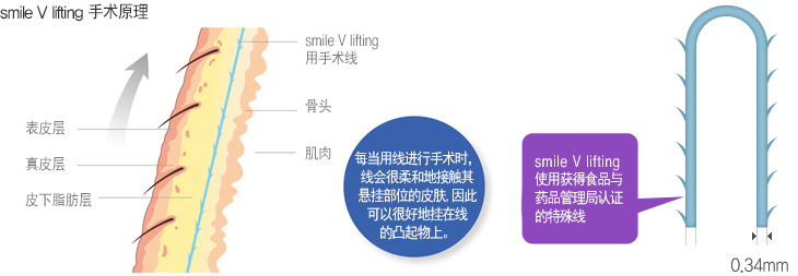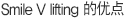 smile V lifting使用食品与药品管理局认证的正品线, 因此很安全。该手术无需剖开, 将线深深注入皮肤皮下层, 出血. 感染以及损伤神经的副作用较少, 简单而安全。 可在脸型与下垂部位等需要提升的部位进行手术, 手术后立马见效, 令您感受到满足的V线条。 smile V lifting将线深深注入皮肤下层, 可促进胶原蛋白的形成, 因此可令您感受到改善肤色的美白效果。