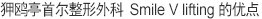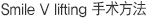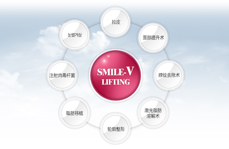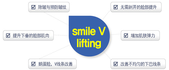 也称作EZ提升的smile V lifting是无需手术,只利用对人体无害的特殊线去除皱纹、提升下垂的肌肤、恢复弹力的肌肤和提升V型脸的手术。这种手术于2005年2月由美国的整形外科学会开发。此后,狎鸥亭首尔整形外科为了提高安全性与顾客满意度,一直进行着临床研究。因为这种线在心脏手术中要使用,所以对人体无害,利用无害的特殊材质的线,不剖开皮肤表面,通过细小的针注入皮肤,这种手术可称作是给与肌肤弹力与提升效果的手术。可在短时间内通过手术期待快捷、安全和半永久性的效果。