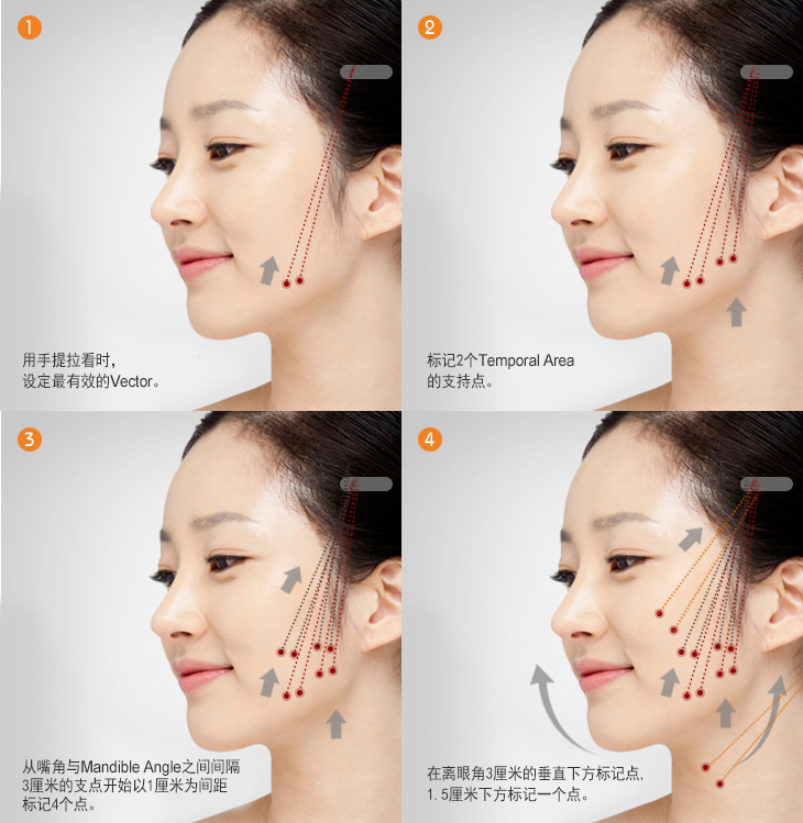 将随着时间的流逝而下垂的下巴肌肉提拉至原形,赋予肌肤弹力。将下垂至下巴骨线条外的皮肤提拉至脸的中心位置,形成V线条。因为是将大范围打开的皮肤聚集到一起,所以可提高脸部整体的充实感,从而改善为童颜之脸。
